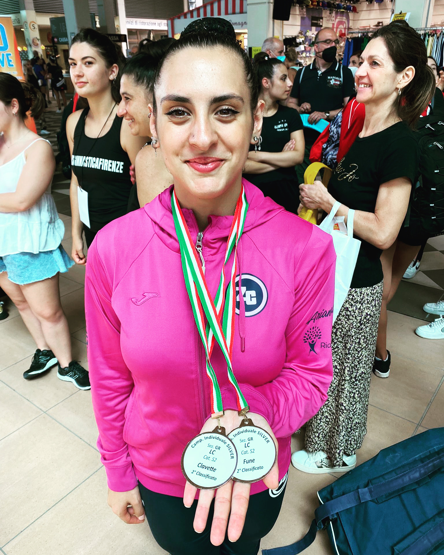 Anche Serena Biasin è capace di galvanizzare il tifo chierese. Serena è la nuova Vice Campionessa Italiana alla Fune e alle Clavette, categoria Senior 2, programma LC. Due attrezzi per lei, due finali conquistate e altrettante medaglie vinte. Una qualifica condotta un po’ in punta di piedi, complice anche la tensione portata dalla lunghezza della gara. 160 partecipanti, l’attesa del risultato finale nel concorso generale avrebbe tenuto con i nervi tesi chiunque. Impreziosisce ancora di più l’impresa di Serena che agguanta entrambe le finali, da una quinta posizione in qualifica e sale di diritto sul secondo gradino del podio nelle due finalissime per attrezzo.