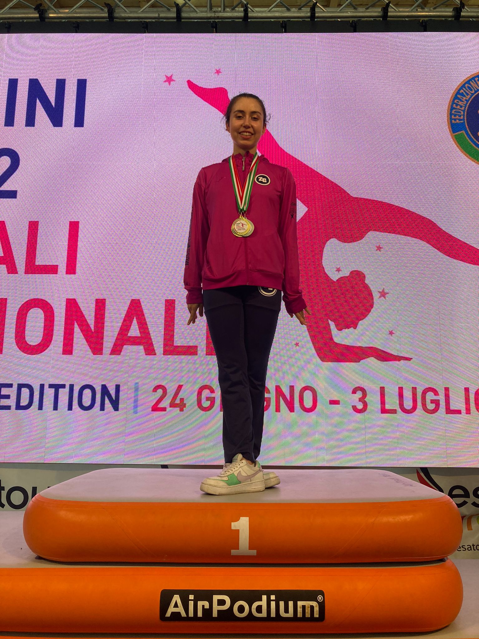 Adelaide Scaglia, classe 2003, e Cecilya Pistamiglio, 2012, conquistano di certo il titolo di questo meraviglioso e importante capitolo di storia della società chierese. Capaci, entrambe, di mettersi al collo ben 3 medaglie!!! Adelaide, in gara nella categoria Senior 3, programma LA1 si laurea Campionessa Italiana AA (all around) conducendo una gara determinata verso la vittoria, lasciando alle avversarie poco spazio di intralcio. Infatti conquista il titolo di Campionessa Italiana anche nella specialità Palla e di Vice Campionessa nazionale al Corpo Libero. 2 ori e 1 argento per Scaglia che corona al meglio una bella e lunga carriera sportiva.
