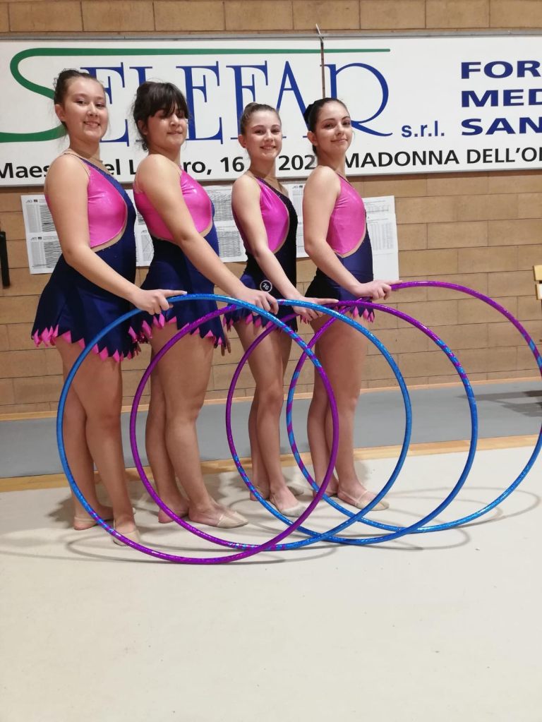 Ad un passo dal podio, in 4^ posizione troviamo poi Giulia Fasano con l’attrezzo palla per la categoria Junior 1 e Nicole Da Dalt con il cerchio nella categoria Allieve 3, più indietro invece la compagna Gaia Spinelli che termina la sua gara in 9^ posizione.