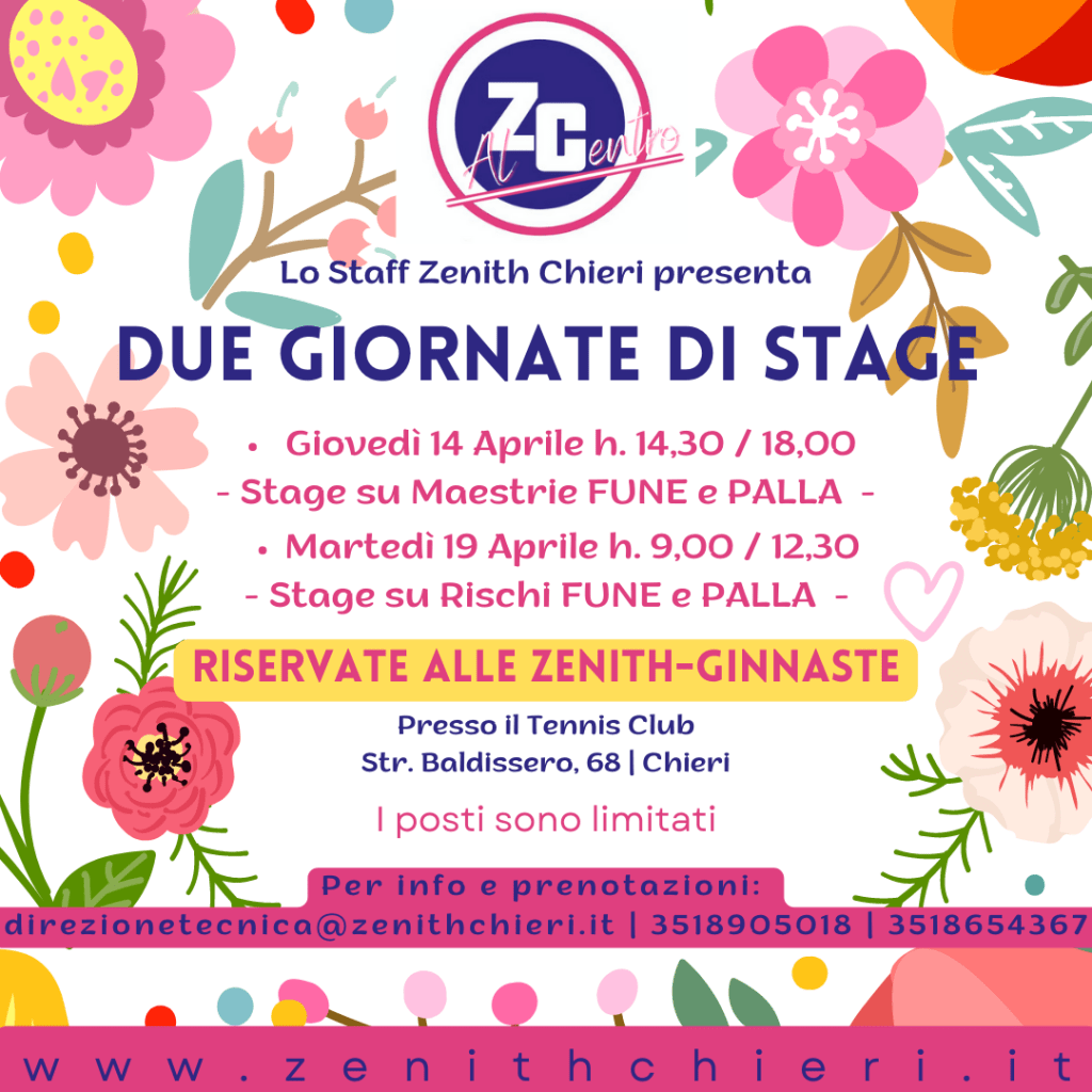Stage estivo di ginnastica ritmica prima della partenza dei corsi della nuova stagione sportiva. Aperto a Zenith-ginnaste e non, con selezioni di ginnaste nate negli anni 2011/2012/2013/2014